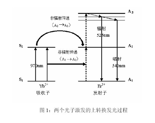 自然界中存在很多有機(jī)或無機(jī)物質(zhì),它們可以在電磁輻射激發(fā)下發(fā)射熒光或磷光,且在發(fā)光過程中遵守Stokes 規(guī)則,即發(fā)射光的波長長于激發(fā)光的波長。而在20 世紀(jì)70 年代,科學(xué)家們卻合成了一類可以反Stokes 規(guī)則產(chǎn)生磷光的特殊材料,即UCPUCP 在紅外光區(qū)(波長>780nm)被激發(fā),卻可以發(fā)射波長遠(yuǎn)短于激發(fā)光的可見光(波長475nm-670nm),即能量上轉(zhuǎn)換。物質(zhì)構(gòu)成決定性質(zhì)特點(diǎn)。UCP 是由稀土金屬元素?fù)诫s于晶體的晶格中構(gòu)成的。在這種材料中有三種主要的成分:主基質(zhì)(Host Matrix)、吸收子(Absorber)和發(fā)射子(Emitter)。作為主基質(zhì)的晶體材料有:氧硫化物(如Y2O2S、GdO2S、La2O2S 等)、氟化物(如YF3GdF3、LaF3 等)、鎵酸鹽(如YGaO3、Y3Ga5O12 等)以及硅酸鹽(如YSi2O5、YSi3O7 等)等;常用作吸收子的稀土金屬離子有:鐿離子(Yb3+)、鉺離子(Er3+)、釤離子(Sm3+)等;常用作發(fā)射子的稀土金屬離子有:鉺離子(Er3+)、鈥離子(Ho3+)、銩離子(Tm3+)、鋱離子(Tb3+)等。吸收子和發(fā)射子這一離子對在主基質(zhì)晶格內(nèi)適宜的空間取向和距離,是產(chǎn)生上轉(zhuǎn)換發(fā)光的基礎(chǔ)。上轉(zhuǎn)換發(fā)光的產(chǎn)生是一個(gè)涉及多個(gè)(至少兩個(gè))光子的光學(xué)過程。在這個(gè)過程中(如圖1),UCP 內(nèi)的吸收子(如Yb3+)至少要吸收兩個(gè)低能量光子(紅外光區(qū),970nm),而后經(jīng)過一系列內(nèi)部能量轉(zhuǎn)換,以非輻射的形式(A1A2,A2A3)將這兩個(gè)光子的能量連續(xù)傳遞給發(fā)射子(如Er3+),以使其處于激發(fā)態(tài)(A3)。后者接著發(fā)生一個(gè)返回基態(tài)能級的躍遷,釋放一個(gè)高能光子(可見光區(qū),如525nm 540nm),完成能量上轉(zhuǎn)換。