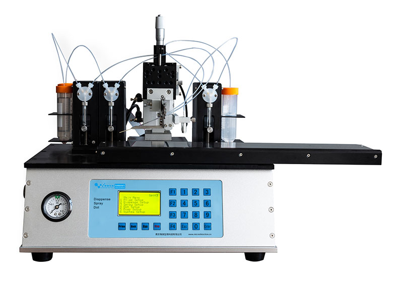 噴金標機應(yīng)用于生產(chǎn)過程中均勻地把膠體金,熒光微球,量子點等顆粒均勻地噴在聚酯膜,玻纖等材料上。進口噴筆保證線條均勻性,是中大型企業(yè)必備的生產(chǎn)設(shè)備之一。